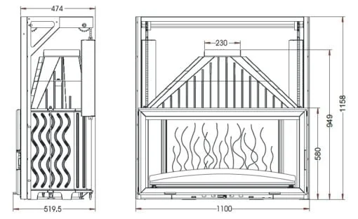 Топка 1100 Grand Vision Relevable вражає своїм сучасним виглядом. Завдяки великому вікну, ви зможете насолоджуватися видовищем палаючого вогню з будь-якої точки кімнати. Її елегантний дизайн дозволяє використовувати топку в інтер’єрах різних стилів, додаючи нотки розкоші у ваш простір. Особливістю даної моделі є механізм підйому, що дозволяє легко відкривати топку, забезпечуючи зручний доступ для завантаження дров.