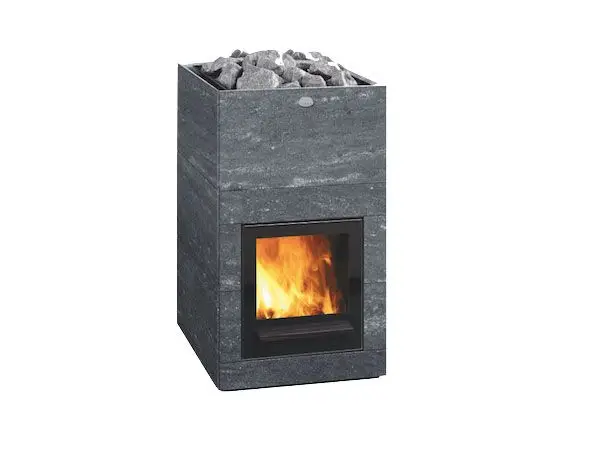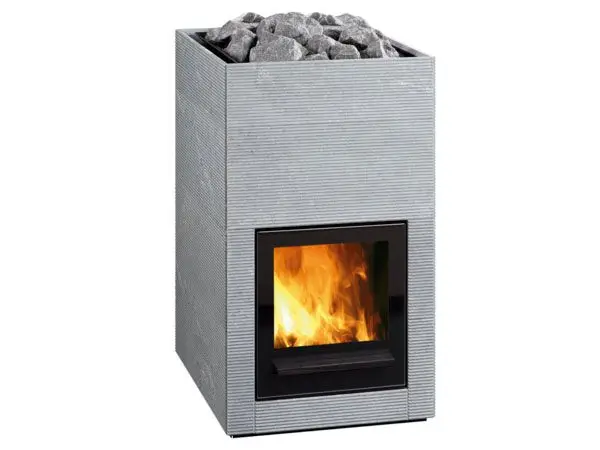 - Піч облицьована природним, рифленим каменем талькомагнезит, що має відмінні теплоакумулюючі властивості. Завдяки високій теплоємності камінь дуже швидко вбирає тепло і довше інших каменів його випромінює. Тепло випромінюється камінням м’яке і ніжне.