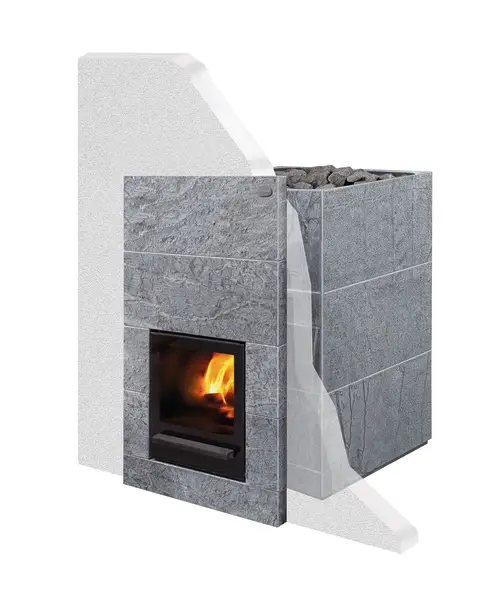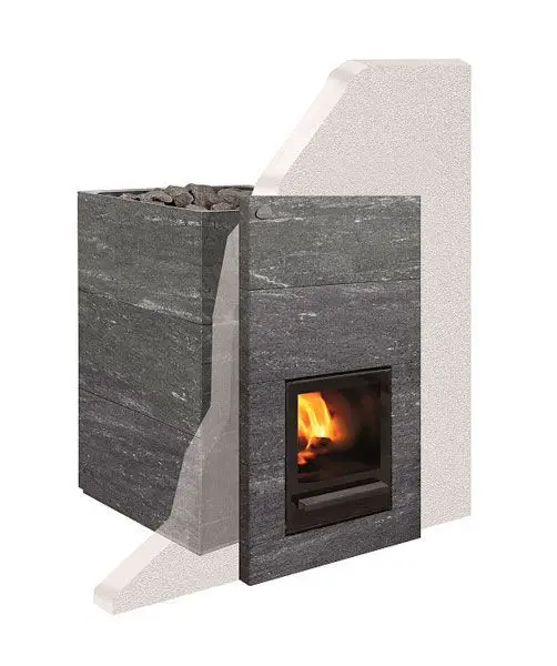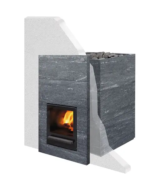 - Облицювання печі виготовлене з природного каменю талькомагнезит. Головною властивістю талькомагнзита є його висока теплоємність, що дозволяє каменю швидко акумулювати велику кількість тепла і випромінювати його тривалий час.