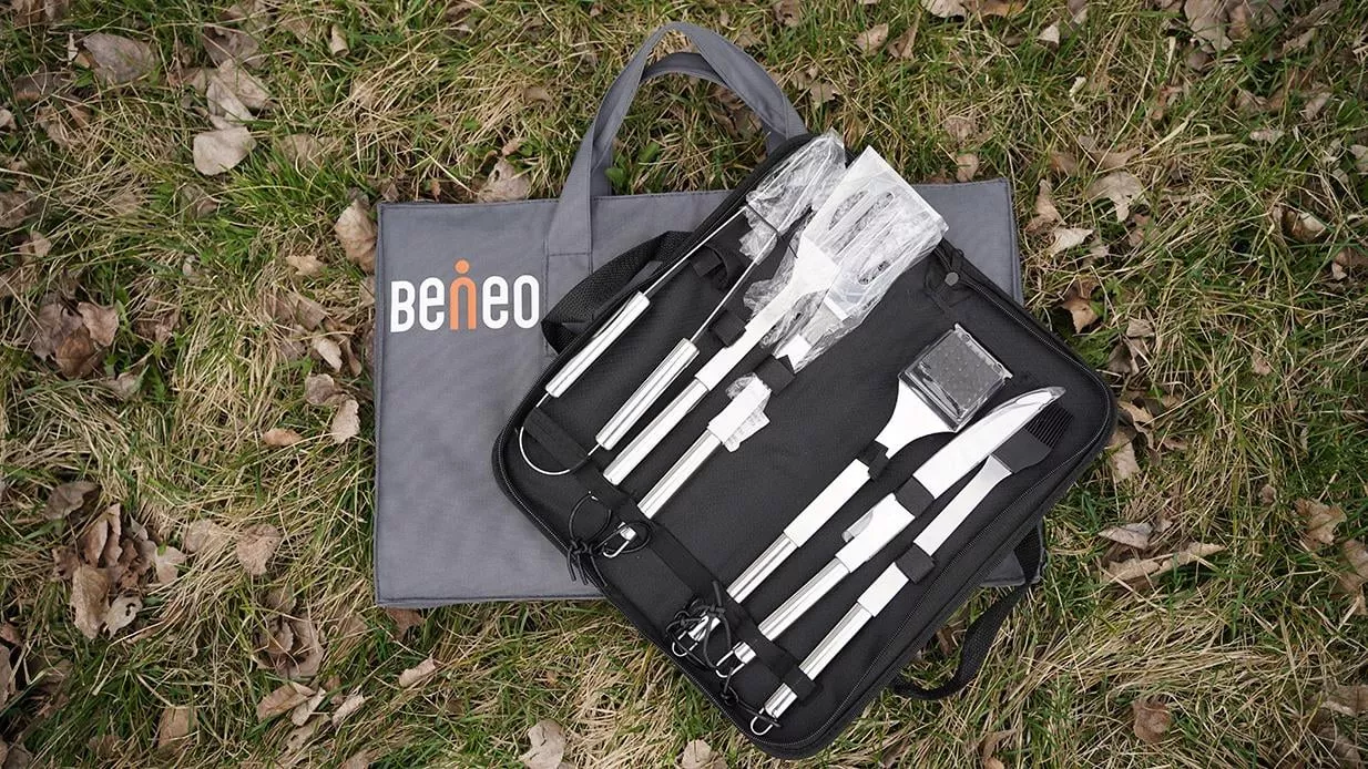 Все приладдя упаковане в презентабельний чохол, в якому зручно переносити та зберігати набір для гриля барбекю.