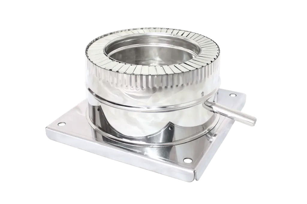 Підлогова підставка для утеплення димоходу (сендвіч) встановлюється на тверду рівну основу і служить опорою для вертикальної частини димоходу. Зверху на підставку підлогову можна встановити ревізію для чищення та огляду димоходу з нержавіючої сталі. Збоку підставка має трубку для відведення конденсату.